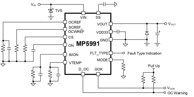 MP5991可检测功率 MOSFET 的栅极、源极与漏极短路情况,并通过故障报告输出 (GOK) 向热插拔控制器提供反馈。MP5991可并联运行以满足大电流应用需求,而且所有并联器件在启动期间主动共享电流。