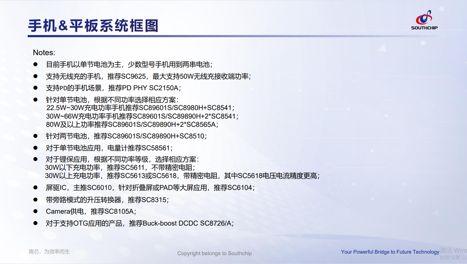 22.5W~30W充电功率手机推荐SC89601S/SC8980H+SC8541;30W~66W充电功率手机推荐SC89601S/SC89890H+2*SC8541;80W及以上功率推荐SC89601S/SC89890H+2*SC8565A;