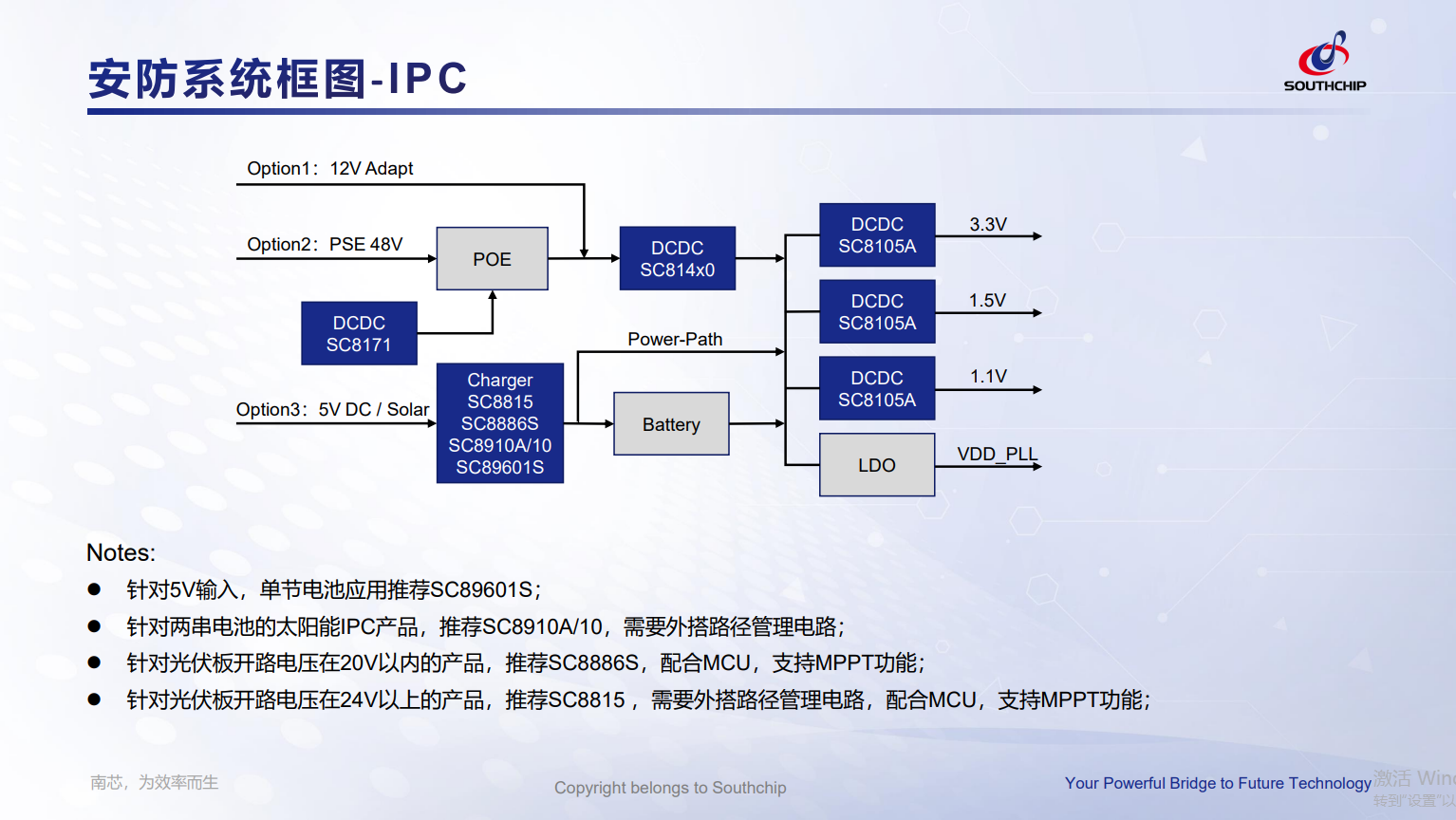 ⚫ 针对两串电池的太阳能IPC产品,推荐SC8910A/10,需要外搭路径管理电路;