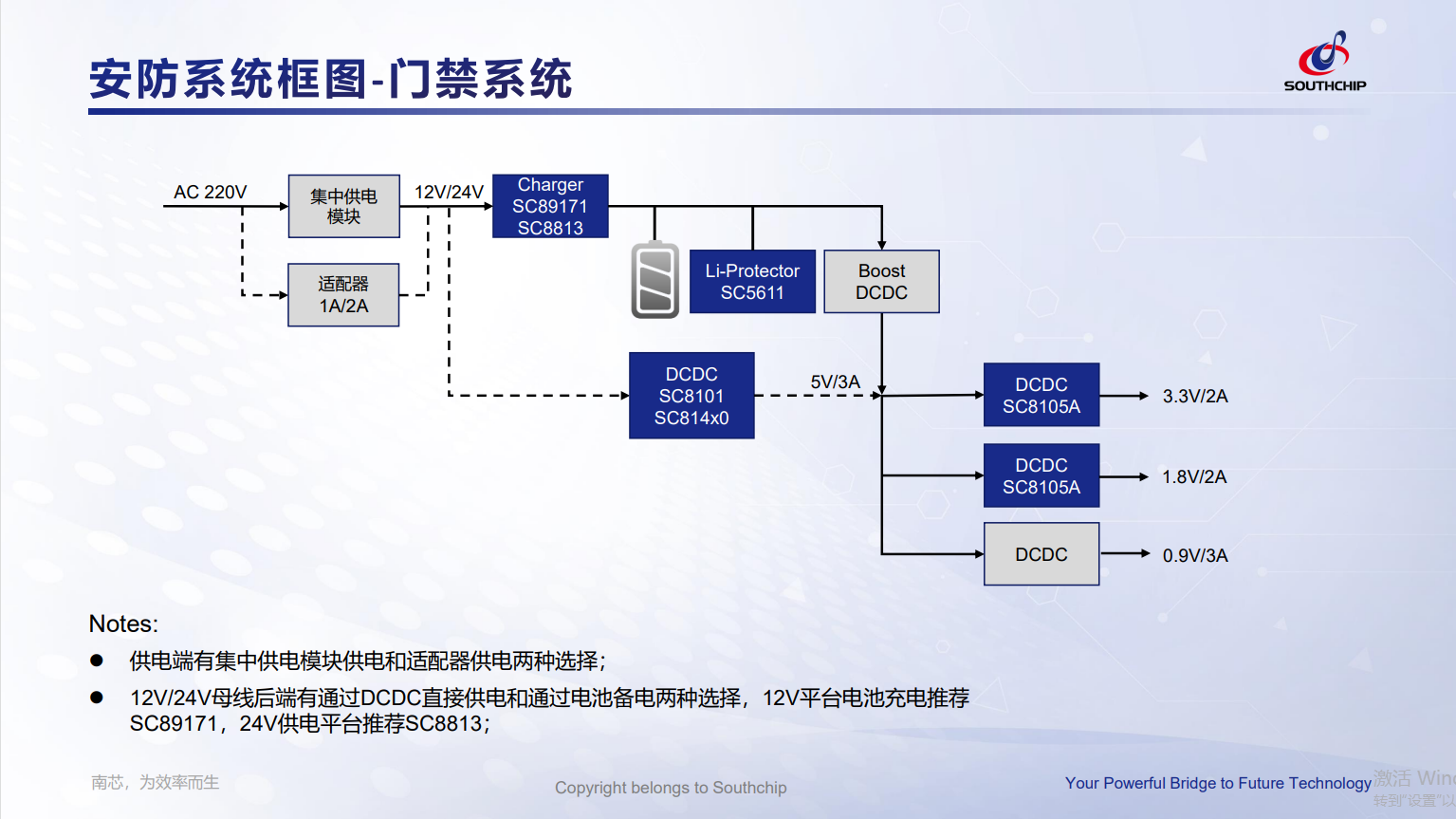 ⚫ 12V/24V母线后端有通过DCDC直接供电和通过电池备电两种选择,12V平台电池充电推荐 SC89171,24V供电平台推荐SC8813;