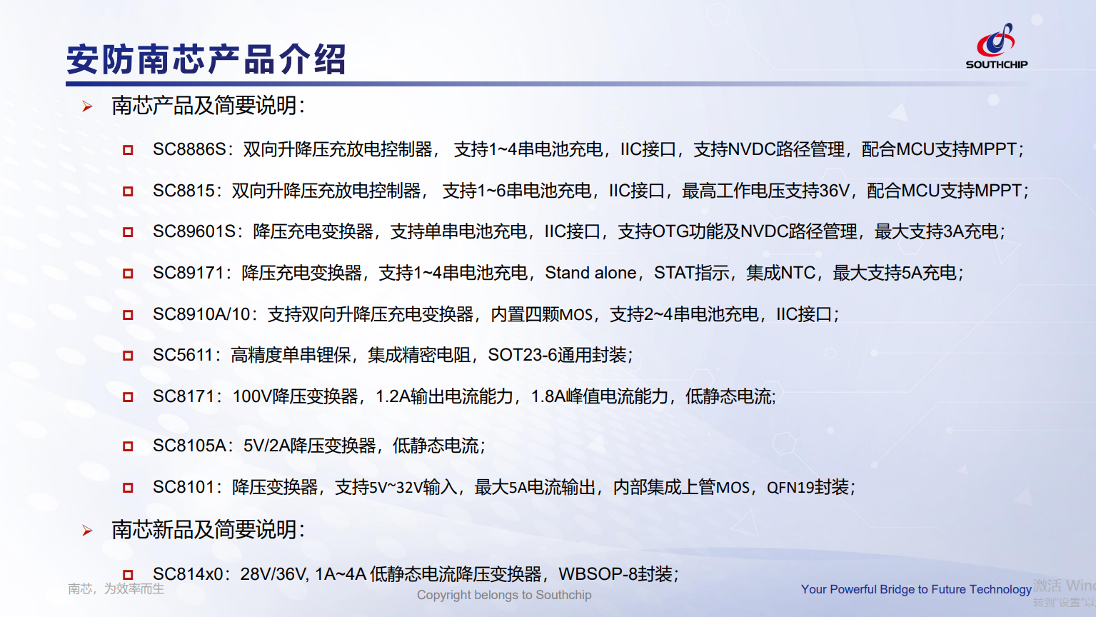 SC89171:降压充电变换器,支持1~4串电池充电,Stand alone,STAT指示,集成NTC,最大支持5A充电; SC8910A/10:支持双向升降压充电变换器,内置四颗MOS,支持2~4串电池充电,IIC接口;