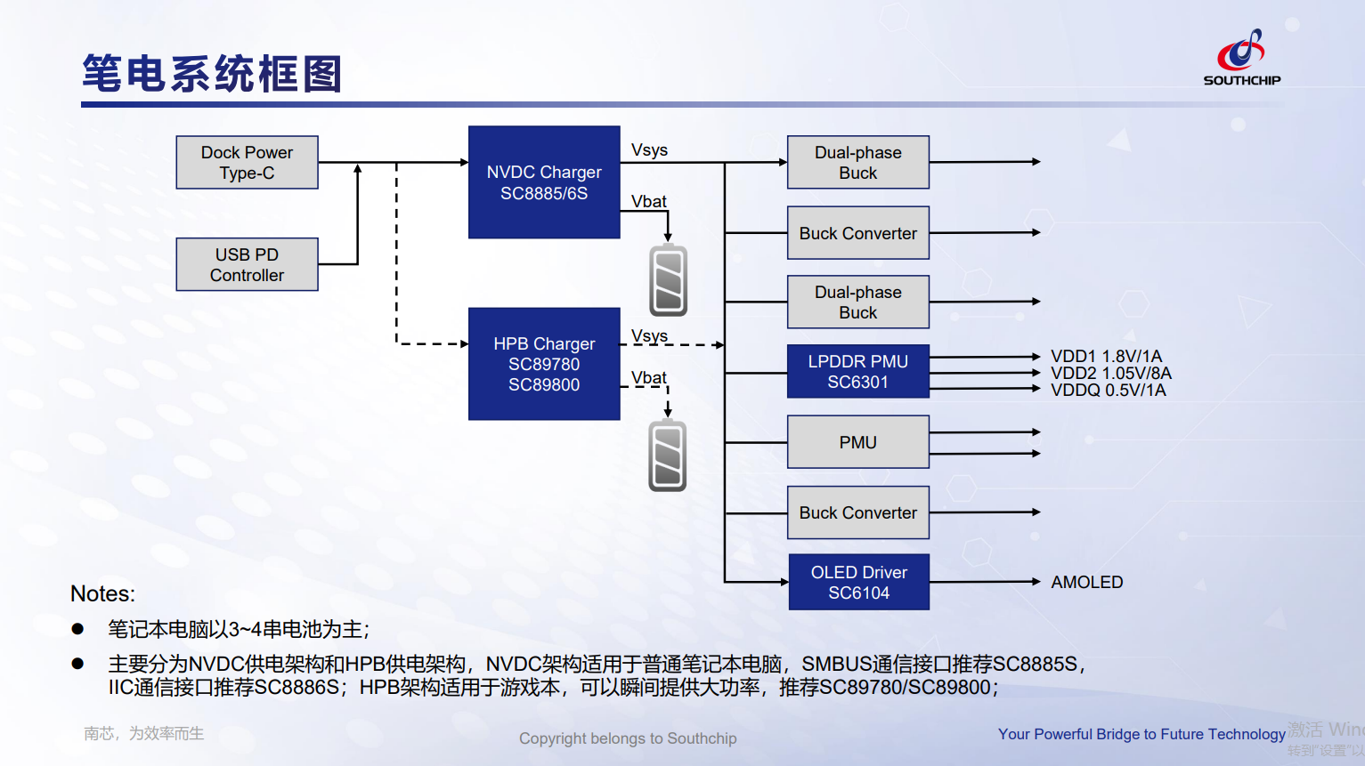 Notes:⚫ 笔记本电脑以3~4串电池为主;⚫ 主要分为NVDC供电架构和HPB供电架构,NVDC架构适用于普通笔记本电脑,SMBUS通信接口推荐SC8885S,IIC通信接口推荐SC8886S;HPB架构适用于游戏本,可以瞬间提供大功率,推荐SC89780/SC89800;