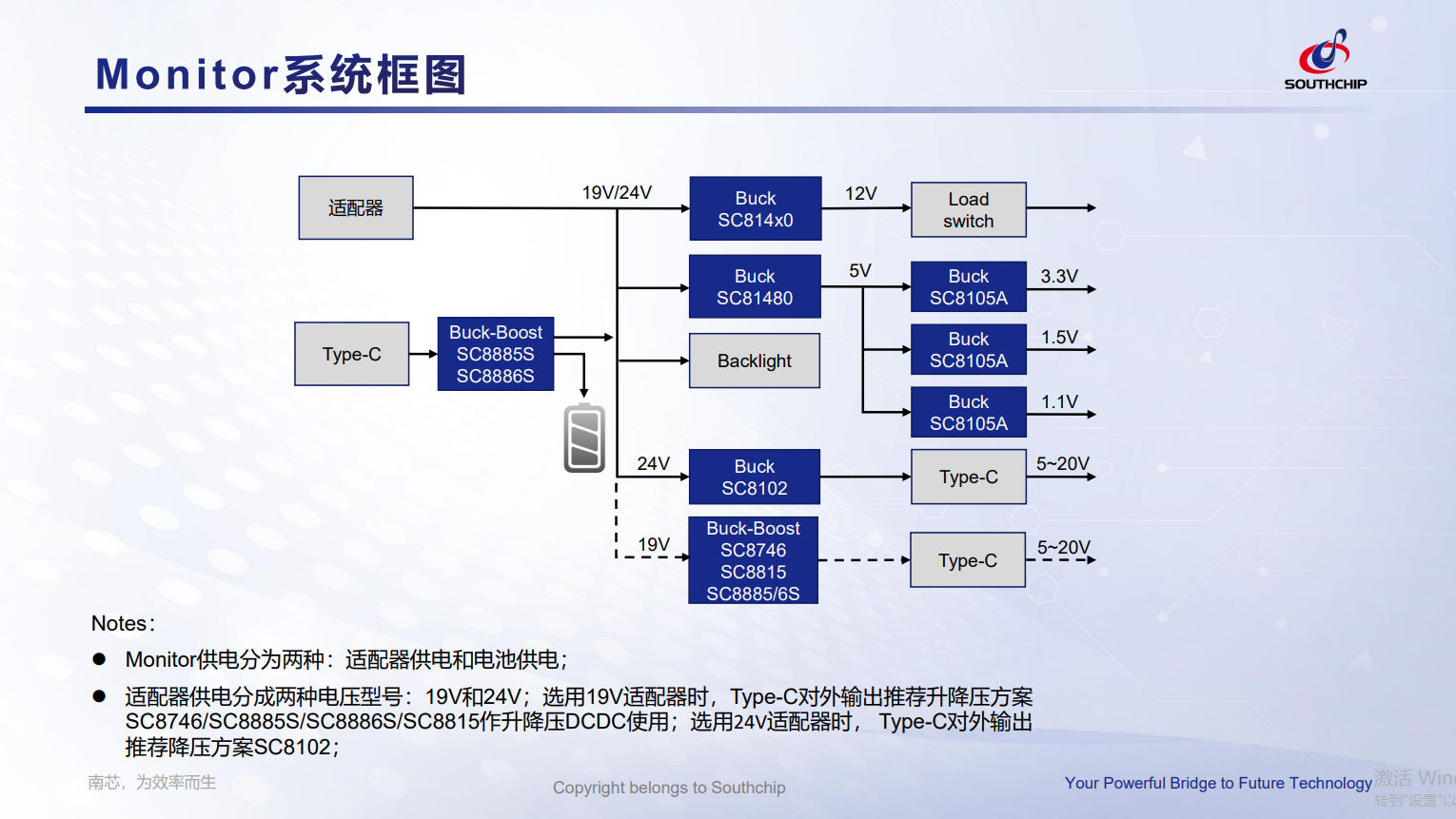 Notes:⚫ Monitor供电分为两种:适配器供电和电池供电;⚫ 适配器供电分成两种电压型号:19V和24V;选用19V适配器时,Type-C对外输出推荐升降压方案SC8746/SC8885S/SC8886S/SC8815作升降压DCDC使用;选用24V适配器时, Type-C对外输出