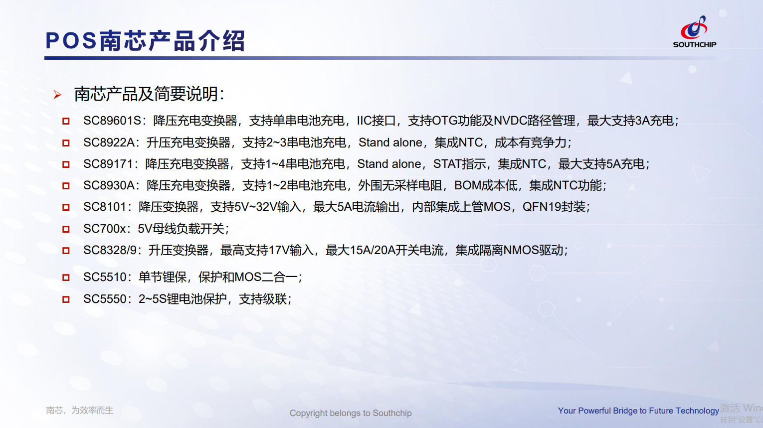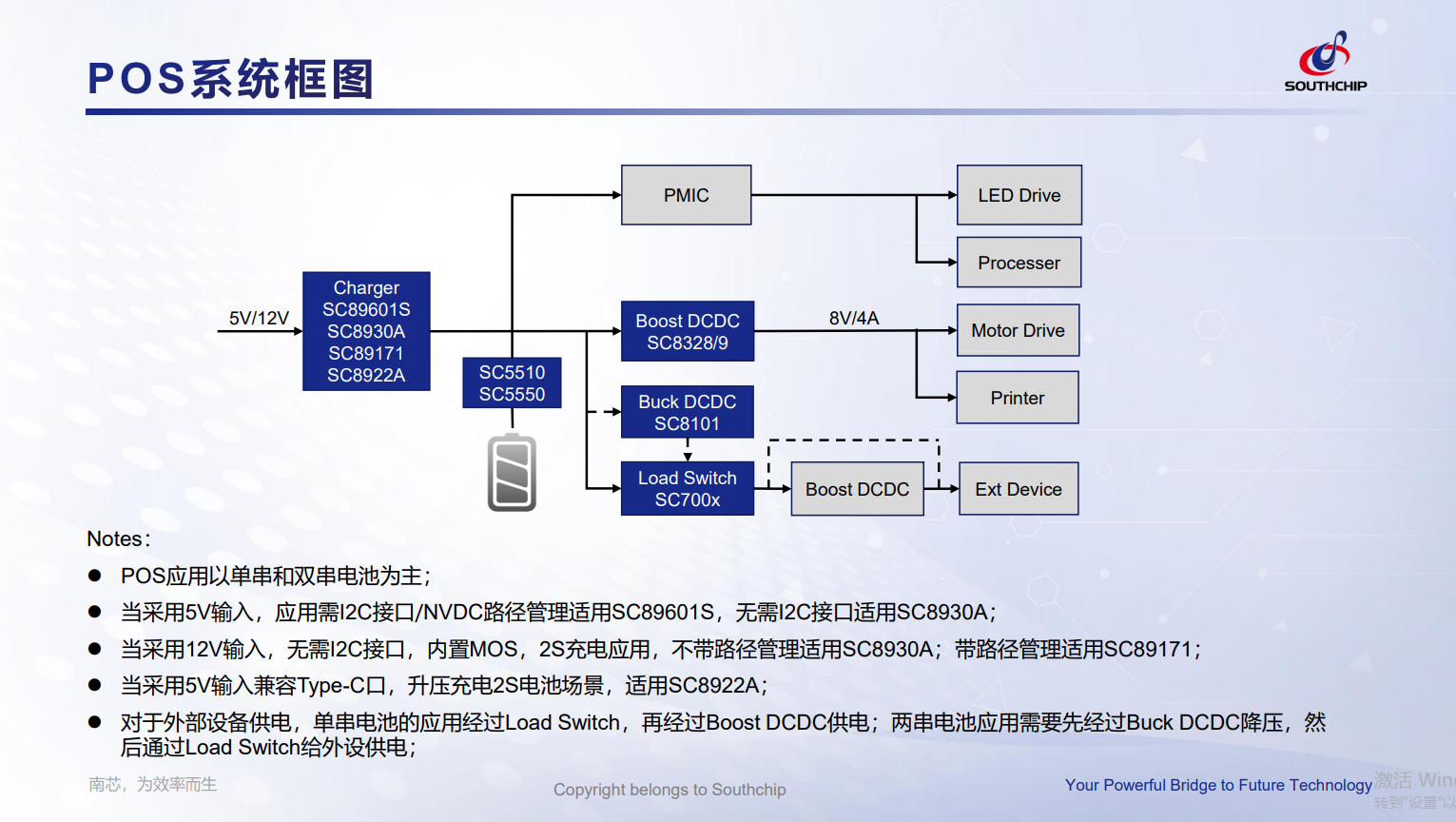 Notes:⚫ POS应用以单串和双串电池为主;⚫ 当采用5V输入,应用需I2C接口/NVDC路径管理适用SC89601S,无需I2C接口适用SC8930A;⚫ 当采用12V输入,无需I2C接口,内置MOS,2S充电应用,不带路径管理适用SC8930A;带路径管理适用SC89171;⚫ 当采用5V输入兼容Type-C口,升压充电2S电池场景,适用SC8922A;⚫ 对于外部设备供电,单串电池的应用经过Load Switch,再经过Boost DCDC供电;两串电池应用需要先经过Buck DCDC降压,然