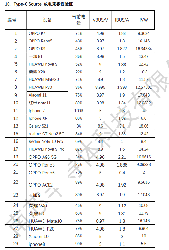 放电兼容性验证 编号 设备 当前电 量 VBUS/V IBUS/A P/W
