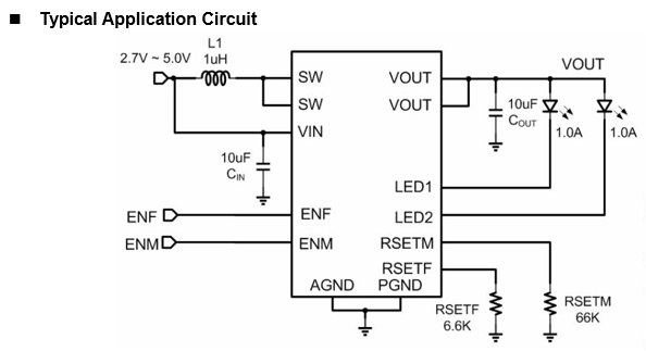 Two simple logic control inputs (ENM and ENF) enable and disable flash and movie mode operation of the AS6533. Movie-mode and Flash-mode current levels are independently fixed by two separate resistors (RSETM and RSETF).