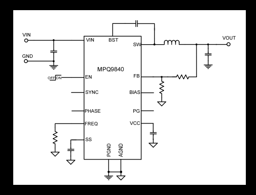 MPQ9840 具备出色的低压差性能,适用于高占空比应用。全方位保护功能包括过流保护(OCP)、短路保护(SCP)和过温关断保护。漏级开路结构的电源正常输出指示(PG)引脚,可指示输出电压是否在正常范围的 10% 内。